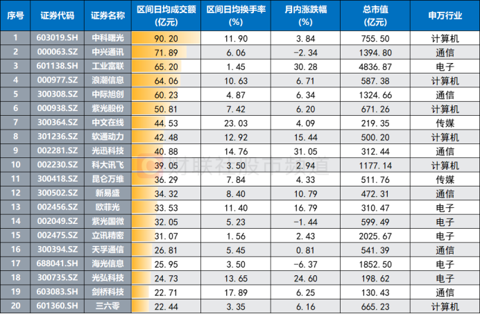 具体个股方面,同样以2月28日至今为区间统计,中科曙光以日均90亿元的成交额成为近期活跃度最高的TMT股,同时,中兴通讯、工业富联、浪潮信息、中际旭创、紫光股份等股近期日均成交额规模也相对较高。若从换手率角度来看,不计算近日上市新股,贝隆精密、思泉新材日均换手率双双突破40%,美信科技、智微智能、亿道信息等股换手率也较高。