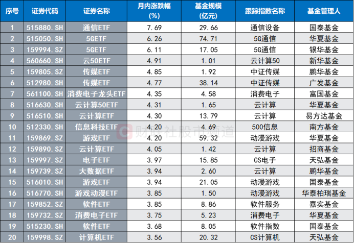 作为刻画AI概念股的主要四大板块,电子、计算机、通信、传媒行业一直是市场热门关注方向,受近期的AI行情带动,与其相关ETF也表现活跃。筛选基金规模超1亿元的TMT相关ETF,截至今日收盘,跟踪通信设备指数的国泰基金通信ETF本月上涨近7.7%,在一众TMT相关ETF中月涨幅居首,华夏基金、银华基金管理的2只5GETF月涨幅也位居前列。