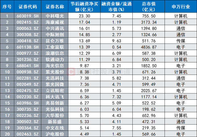 注:节后以来近1个月(2月19日至3月12日)融资资金净买额居前的TMT股