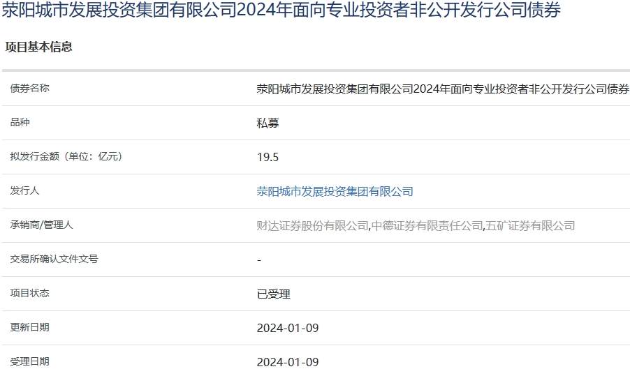 【大河财立方消息】1月10日消息,荥阳城市发展投资集团有限公司2024年面向专业投资者非公开发行公司债券项目已获上交所受理,债券拟发行金额19.5亿元,承销商/管理人为财达证券、中德证券、五矿证券。2023年9月25日,经中债资信综合评定,发行人主体信用评级为A-r,评级展望为稳定。